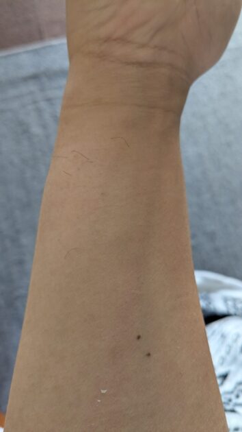 ちょこザップの脱毛機で腕は特に念入りにしたせいなのか足と比べてほぼムラなく毛がなくなりました。